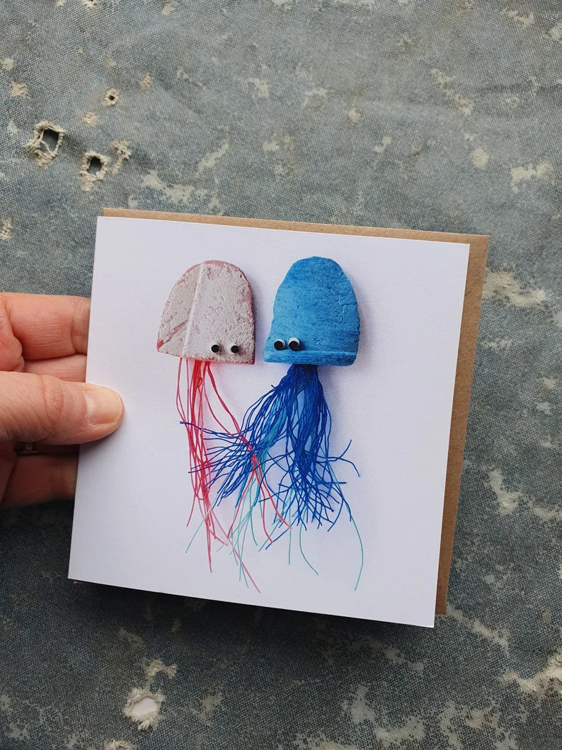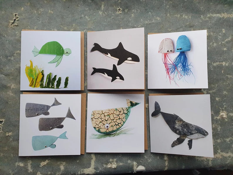 This pack of six cards feature a flip flop whale, a pod of three whales, a pair of cute jelly fish, a humpback whale, orcas and a turtle.